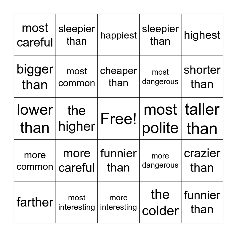 This bingo card has a free space and 24 words: more careful, most interesting, cheaper than, farther, highest, most careful, bigger than, sleepier than, most polite, funnier than, most dangerous, lower than, more dangerous, crazier than, most common, the colder, taller than, happiest, shorter than, the higher, funnier than, more common, sleepier than and more interesting.