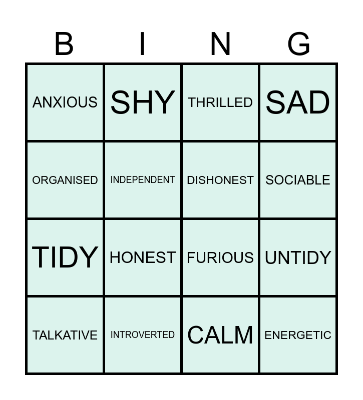 This bingo card has 16 words: INTROVERTED, UNTIDY, THRILLED, ANXIOUS, TIDY, SHY, FURIOUS, CALM, ORGANISED, INDEPENDENT, TALKATIVE, SAD, HONEST, SOCIABLE, DISHONEST and ENERGETIC.