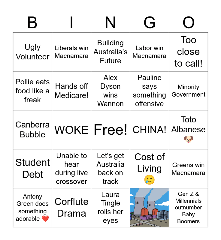 This bingo card has 2 images, a free space and 27 words: Antony Green does something adorable ❤️, WOKE, Amelia Hamer Property Portfolio, Ugly Volunteer, Building Australia's Future, Hands off Medicare!, Unable to hear during live crossover, CHINA!, Corflute Drama, Toto Albanese 🐶, Gen Z & Millennials outnumber Baby Boomers, Laura Tingle rolls her eyes, Minority Government, RACISM!, Let's get Australia back on track, Student Debt, Too close to call!, Canberra Bubble, Cost of Living 🥲, No more coal and gas!, Pauline says something offensive, Pollie eats food like a freak, Labor win Macnamara, Liberals win Macnamara, Greens win Macnamara, Alex Dyson wins Wannon and Monique Ryan wins Kooyong.