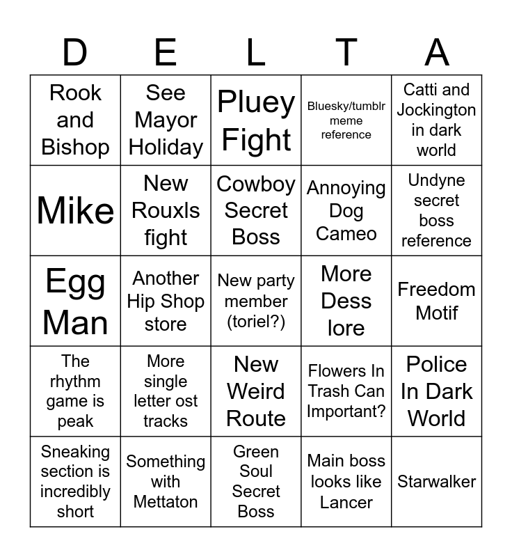 This bingo card has 25 words: More single letter ost tracks, Green Soul Secret Boss, Cowboy Secret Boss, Sneaking section is incredibly short, Catti and Jockington in dark world, Rook and Bishop, Mike, See Mayor Holiday, More Dess lore, New Weird Route, Annoying Dog Cameo, Egg Man, Flowers In Trash Can Important?, Police In Dark World, New Rouxls fight, Starwalker, Freedom Motif, Pluey Fight, Undyne secret boss reference, Another Hip Shop store, New party member (toriel?), Something with Mettaton, The rhythm game is peak, Bluesky/tumblr meme reference and Main boss looks like Lancer.
