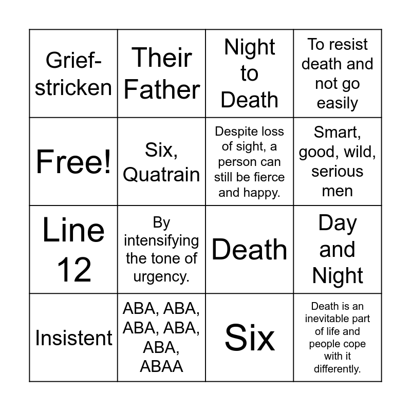 This bingo card has 16 words: ABA, ABA, ABA, ABA, ABA, ABAA, Day and Night, Night to Death, Grief-stricken, Line 12, Their Father, Death, Six, Free!, Six, Quatrain, Insistent, To resist death and not go easily, By intensifying the tone of urgency., Smart, good, wild, serious men, Despite loss of sight, a person can still be fierce and happy. and Death is an inevitable part of life and people cope with it differently..
