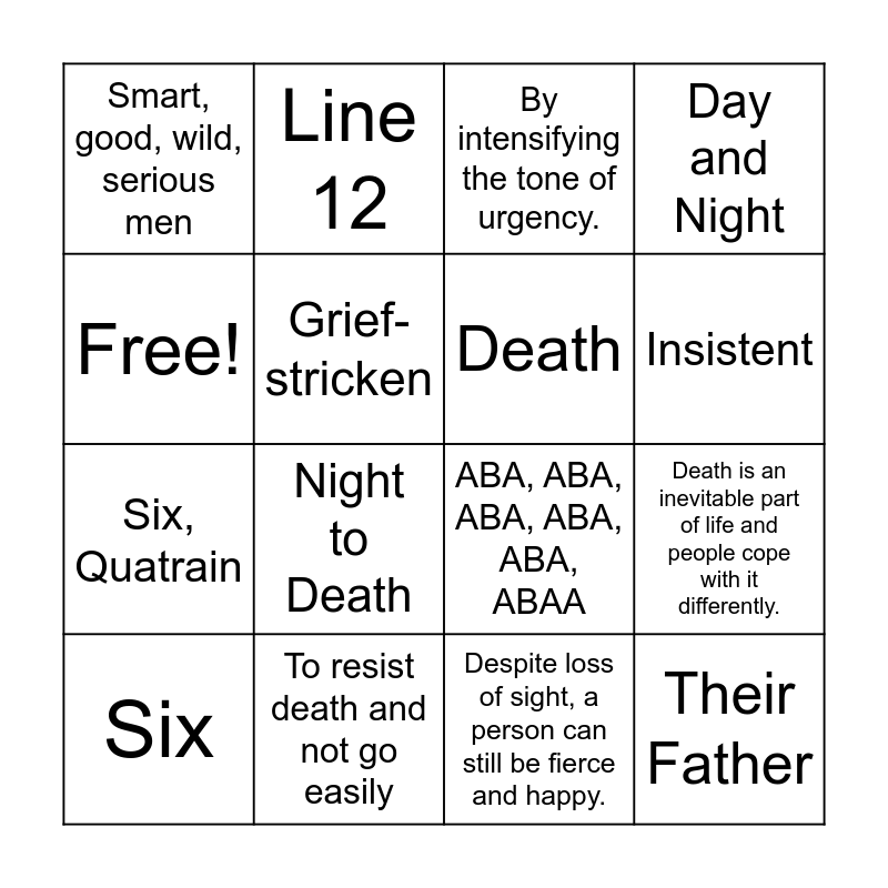 This bingo card has 16 words: To resist death and not go easily, Death is an inevitable part of life and people cope with it differently., By intensifying the tone of urgency., Smart, good, wild, serious men, Six, Quatrain, Line 12, ABA, ABA, ABA, ABA, ABA, ABAA, Despite loss of sight, a person can still be fierce and happy., Free!, Grief-stricken, Six, Day and Night, Night to Death, Insistent, Death and Their Father.