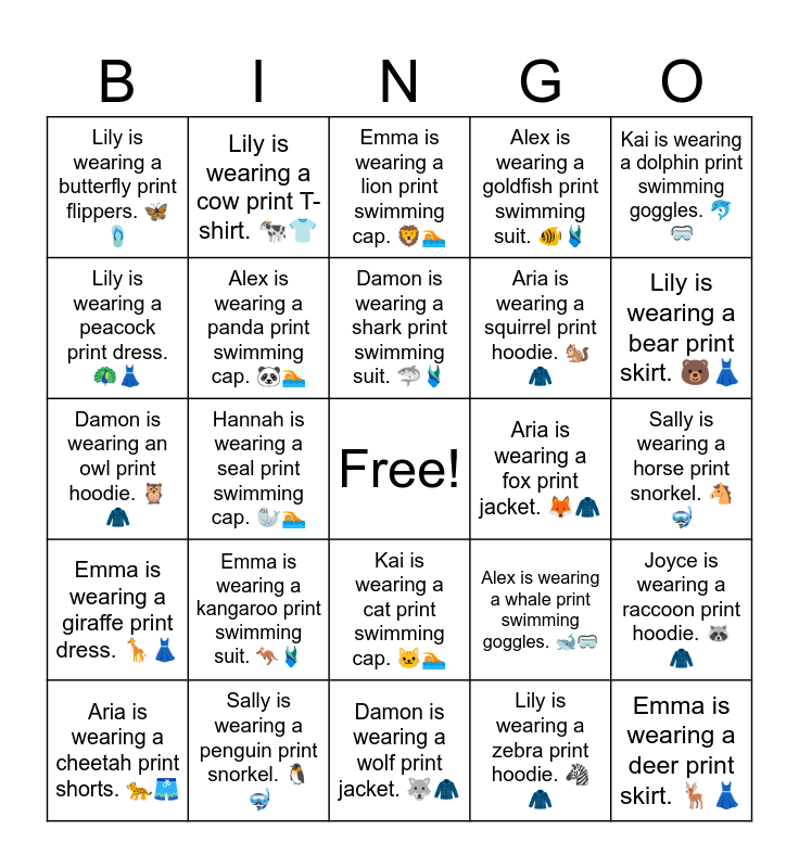 This bingo card has a free space and 34 words: Aria is wearing a tiger print T-shirt. π―π, Lily is wearing a zebra print hoodie. π¦π§₯, Sally is wearing a leopard print skirt. ππ, Damon is wearing a snake print jacket. ππ§₯, Emma is wearing a giraffe print dress. π¦π, Alex is wearing a panda print swimming cap. πΌπ, Kai is wearing a dolphin print swimming goggles. π¬π₯½, Aria is wearing a cheetah print shorts. ππ©³, Lily is wearing a cow print T-shirt. ππ, Sally is wearing a bunny print hoodie. π°π§₯, Damon is wearing a shark print swimming suit. π¦π©±, Emma is wearing a lion print swimming cap. π¦π, Alex is wearing a parrot print life vest. π¦π¦Ί, Kai is wearing a crab print flippers. π¦π©΄, Aria is wearing a fox print jacket. π¦π§₯, Lily is wearing a bear print skirt. π»π, Sally is wearing a penguin print snorkel. π§π€Ώ, Damon is wearing an owl print hoodie. π¦π§₯, Emma is wearing a kangaroo print swimming suit. π¦π©±, Alex is wearing a whale print swimming goggles. ππ₯½, Kai is wearing a cat print swimming cap. π±π, Aria is wearing a dog print life vest. πΆπ¦Ί, Lily is wearing a butterfly print flippers. π¦π©΄, Sally is wearing a horse print snorkel. π΄π€Ώ, Damon is wearing a wolf print jacket. πΊπ§₯, Emma is wearing a deer print skirt. π¦π, Alex is wearing a goldfish print swimming suit. π π©±, Kai is wearing a turtle print swimming goggles. π’π₯½, Aria is wearing a squirrel print hoodie. πΏοΈπ§₯, Lily is wearing a peacock print dress. π¦π, Hannah is wearing a flamingo print swimming suit. π¦©π©±, Hannah is wearing a seal print swimming cap. π¦π, Joyce is wearing a raccoon print hoodie. π¦π§₯ and Joyce is wearing a koala print life vest. π¨π¦Ί.