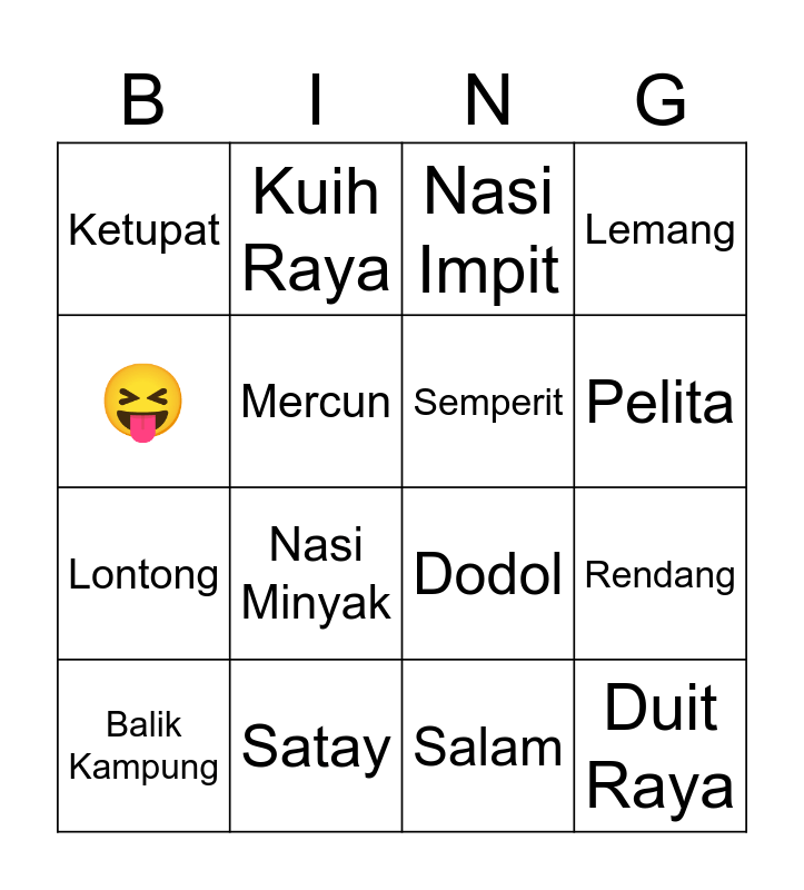 This bingo card has 16 words: Satay, Rendang, Nasi Impit, Ketupat, Lontong, Kuih Raya, Dodol, Salam, 😝, Mercun, Balik Kampung, Lemang, Nasi Minyak, Pelita, Semperit and Duit Raya.
