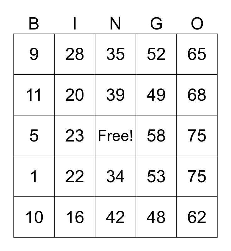 This bingo card has a free space and 24 words: 10, 22, 39, 48, 65, 9, 28, 35, 58, 75, 5, 20, 53, 75, 11, 16, 42, 52, 68, 1, 23, 34, 49 and 62.