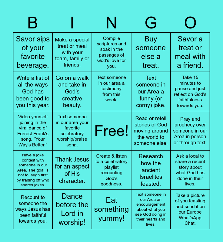 This bingo card has a free space and 24 words: Thank Jesus for an aspect of His character., Dance before the Lord in worship!, Text someone in our area a testimony from this week., Recount to someone the ways Jesus has been faithful towards you., Savor a treat or meal with a friend., Savor sips of your favorite beverage., Write a list of all the ways God has been good to you this year., Make a special treat or meal with your team, family or friends., Read or retell stories of God moving around the world to someone else., Create & listen to a celebratory playlist recounting God's goodness., Text someone in our Area a funny (or corny) joke., Video yourself joining in the viral dance of Forrest Frank's song, "Your Way's Better.", Research how the ancient Israelites feasted., Ask a local to share a recent story about what God has done in their lives., Go on a walk and take in God's creative beauty., Text someone in our Area an encouragement about what you see God doing in their hearts and lives., Pray and prophecy over someone in our Area in person or through text., Compile scriptures and soak in the passages of God's love for you., Take 15 minutes to pause and just reflect on God's faithfulness towards you., Text someone in our area your favorite celebratory worship/praise song., Take a picture of you feasting and send it on our Europe What'sApp Chat., Have a joke contest with someone in our Area. The goal is not to laugh first by trading off who shares jokes., Buy someone else a treat. and Eat something yummy!.
