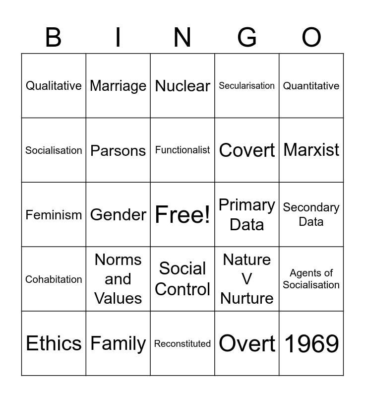 This bingo card has a free space and 24 words: Norms and Values, Family, Functionalist, Ethics, Quantitative, Qualitative, Socialisation, Marriage, Primary Data, Social Control, Covert, Feminism, Nature V Nurture, Agents of Socialisation, Parsons, Overt, Secondary Data, Nuclear, Marxist, Gender, 1969, Cohabitation, Secularisation and Reconstituted.