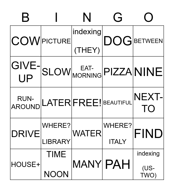 This bingo card has a free space and 24 words: WHERE? LIBRARY, TIME NOON, EAT-MORNING, HOUSE+, BETWEEN, COW, GIVE-UP, PICTURE, BEAUTIFUL, WATER, PIZZA, RUN-AROUND, WHERE? ITALY, FIND, SLOW, PAH, NEXT-TO, indexing (THEY), NINE, LATER, indexing (US-TWO), DRIVE, DOG and MANY.