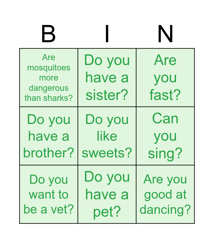 This bingo card has 9 words: Do you want to be a vet?, Are you fast?, Do you have a sister?, Do you have a brother?, Are mosquitoes more dangerous than sharks?, Can you sing?, Do you like sweets?, Are you good at dancing? and Do you have a pet?.