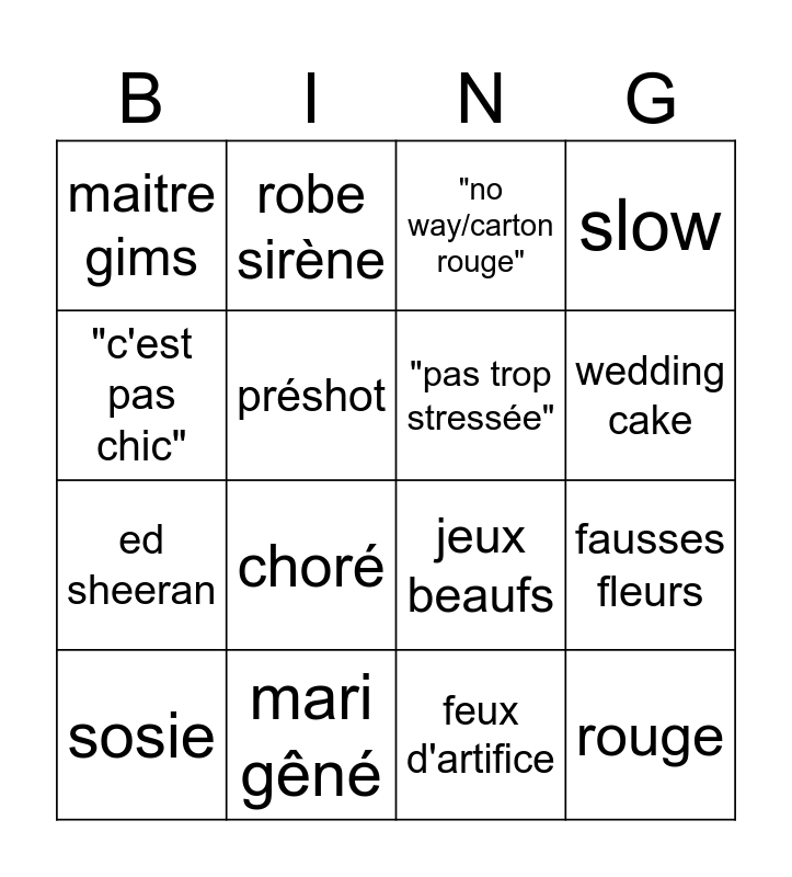 This bingo card has 16 words: mari gêné, fausses fleurs, "no way/carton rouge", maitre gims, ed sheeran, robe sirène, jeux beaufs, feux d'artifice, "c'est pas chic", préshot, sosie, slow, choré, wedding cake, "pas trop stressée" and rouge.