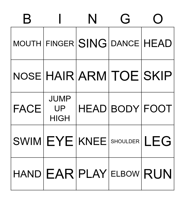 This bingo card has a free space and 24 words: EYE, EAR, ARM, HAND, HEAD, MOUTH, NOSE, FINGER, BODY, KNEE, TOE, FACE, SHOULDER, LEG, HAIR, ELBOW, FOOT, SING, SKIP, JUMP UP HIGH, RUN, SWIM, DANCE and PLAY.