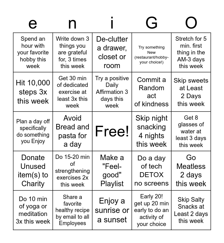 This bingo card has a free space and 27 words: Do a day of tech DETOX no screens, Get 7-9 hours of sleep for at least 3 days in one week, Commit a Random act of kindness, Enjoy a sunrise or a sunset, Hit 10,000 steps 3x this week, De-clutter a drawer, closet or room, Write down 3 things you are grateful for, 3 times this week, Donate Unused item(s) to Charity, Skip night snacking 4 nights this week, Go Meatless 2 days this week, Plan a day off specifically do something you Enjoy, Try something New (restaurant/hobby- your choice!), Do 10 min of yoga or meditation 3x this week, Share a favorite healthy recipe by email to all Employees, Skip sweets at Least 2 Days this week, Get in touch with nature (a hike, swim,walk in the woods), Get 30 min of dedicated exercise at least 3x this week, Try a positive Daily Affirmation 3 days this week, Do 15-20 min of strengthening exercises 2x this week, Spend an hour with your favorite hobby this week, Get 8 glasses of water at least 3 days this week, Early 20! get up 20 min early to do an activity of your choice, Avoid Bread and pasta for a day, Skip Salty Snacks at Least 2 days this week, Make a "Feel- good" Playlist, Stretch for 5 min. first thing in the AM-3 days this week and Reach out to a friend of family member you have not spoken to recently.