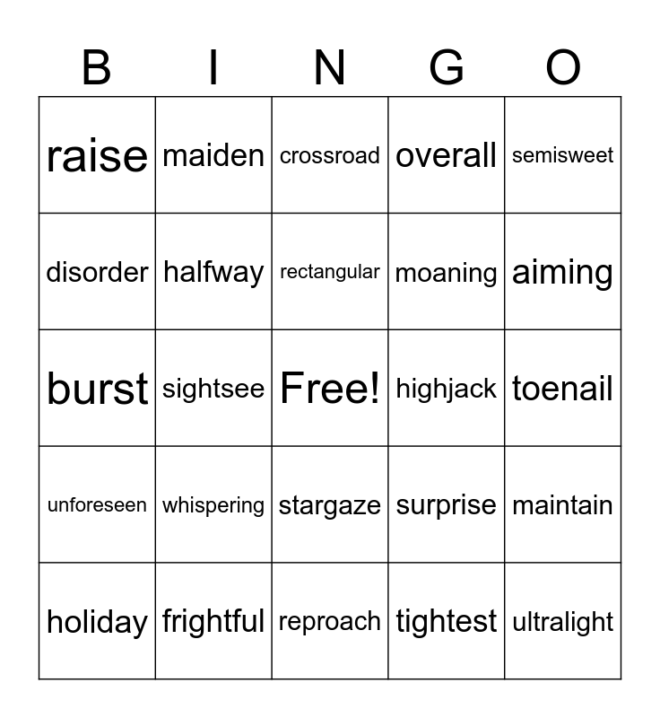 This bingo card has a free space and 24 words: whispering, frightful, rectangular, holiday, semisweet, raise, disorder, maiden, highjack, stargaze, moaning, burst, surprise, maintain, halfway, tightest, toenail, crossroad, aiming, sightsee, ultralight, unforeseen, overall and reproach.