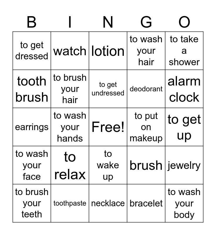 This bingo card has a free space and 39 words: to go to bed, to shave, to take a bath, to brush your hair, to brush your teeth, to wake up, to get undressed, to fall asleep, to take a shower, to wash your face, to wash your hands, to wash your hair, to wash your body, to get up, to put on makeup, to relax, to dry off, to get dressed, ring, brush, tooth brush, necklace, deodorant, alarm clock, mirror, soap, makeup, toilet paper, perfume, watch, hair dryer, shaving cream, lotion, toothpaste, bracelet, towel, jewelry, earrings and contact lenses.
