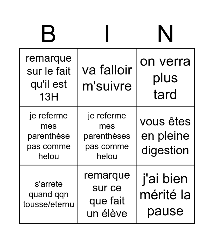This bingo card has a free space and 11 words: Paul allez y, remarque sur ce que fait un élève, j'ai bien mérité la pause, s'arrete quand qqn tousse/eternu, va falloir m'suivre, on verra plus tard, vous êtes en pleine digestion, bon la il va falloir bien se concentrer, je referme mes parenthèse pas comme helou, remarque sur le fait qu'il est 13H and critique Trump.