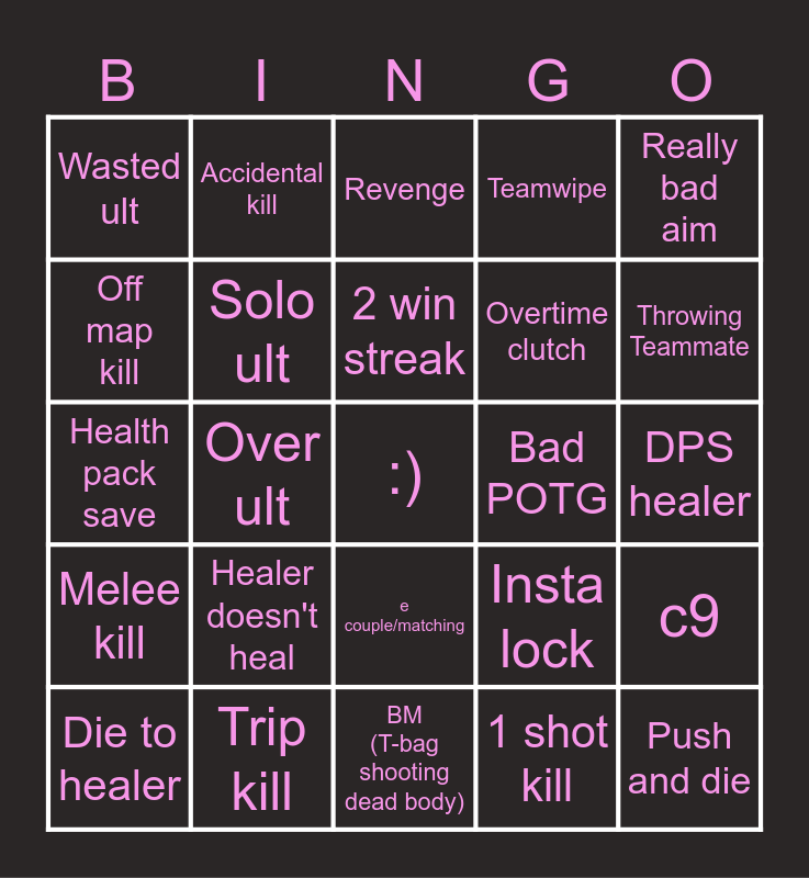 This bingo card has a free space and 24 words: Healer doesn't heal, Trip kill, 2 win streak, Die to healer, Really bad aim, Wasted ult, Off map kill, Accidental kill, Bad POTG, e couple/matching, Overtime clutch, Health pack save, Insta lock, c9, Solo ult, 1 shot kill, DPS healer, Revenge, Throwing Teammate, Over ult, Push and die, Melee kill, Teamwipe and BM (T-bag shooting dead body).