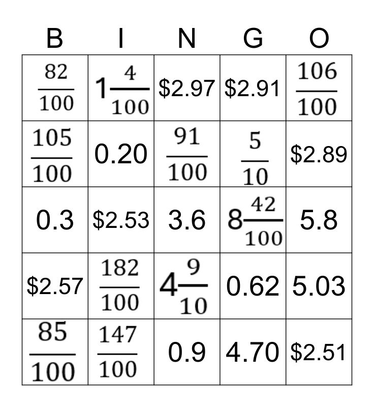 This bingo card has 11 images, a free space and 13 words: 0.3, 0.62, 5.03, 0.20, 4.70, 5.8, $2.97, $2.89, $2.53, $2.51, $2.57, $2.91 and 0.9.