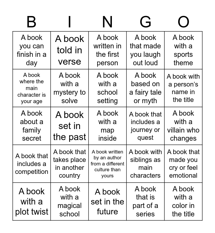 This bingo card has 51 words: Free!, A book with a map inside, A book with a one-word title, A book set in the future, A book that takes place in another country, A book with a mythical creature, A book told in verse, A book with a strong female lead, A book where the main character is your age, A book with a talking animal, A book with a mystery to solve, A book that made you laugh out loud, A book that made you cry or feel emotional, A book with siblings as main characters, A book set during summer, A book with a non-human main character, A book with a school setting, A book that includes a journey or quest, A book with magic or spells, A book with a sports theme, A book set in the past, A book that is part of a series, A book you can finish in a day, A book based on a fairy tale or myth, A book that takes place in a city, A book with a color in the title, A book with a person’s name in the title, A book that includes letters, emails, or diary entries, A book with a plot twist, A book written in the first person, A book with a graphic novel format, A book where the main character faces a fear, A book featuring a friendship challenge, A book that includes a secret, A book about standing up for what’s right, A book with a magical school, A book where the characters go on a road trip or travel, A book about fitting in or being different, A book with multiple points of view, A book that takes place in nature or the wilderness, A book with a villain who changes, A book that includes a competition, A book that was recommended by a friend or teacher, A book where someone learns a big lesson, A book with a beautiful cover, A book involving technology or AI, A book about a family secret, A book where the main character has a special talent or power, A book with a title that starts with the letter “S”, A book written by an author from a different culture than yours and A book that’s been turned into a movie or TV show.