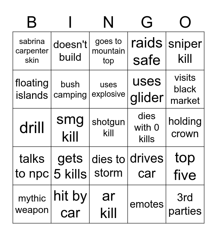 This bingo card has a free space and 24 words: gets 5 kills, hit by car, uses explosive, mythic weapon, sniper kill, sabrina carpenter skin, floating islands, doesn't build, dies with 0 kills, dies to storm, uses glider, drill, drives car, top five, bush camping, emotes, holding crown, goes to mountain top, visits black market, smg kill, 3rd parties, talks to npc, raids safe and ar kill.