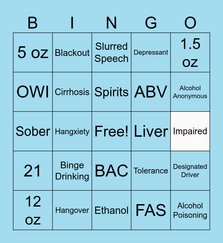 This bingo card has a free space and 24 words: Binge Drinking, Hangover, Spirits, 12 oz, 1.5 oz, 5 oz, OWI, Blackout, Liver, BAC, ABV, Sober, Tolerance, Designated Driver, Cirrhosis, FAS, Impaired, Slurred Speech, Alcohol Anonymous, Hangxiety, Alcohol Poisoning, 21, Depressant and Ethanol.