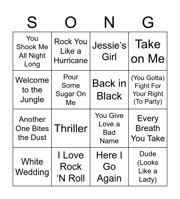 This bingo card has 35 words: Don’t Stop Believin’, Livin’ on a prayer, Eye of the Tiger, Back in Black, Billie Jean, Take on Me, Pour Some Sugar On Me, Jump, (You Gotta) Fight For Your Right (To Party), The Final Countdown, You Give Love a Bad Name, Welcome to the Jungle, Crazy Train, We’re Not Gonna Take It, You Shook Me All Night Long, I Love Rock ‘N Roll, Free Fallin’, Every Breath You Take, Dude (Looks Like a Lady), White Wedding, I Hate Myself For Loving You, Paradise City, Hit Me With Your Best Shot, Born In the U.S.A., Jessie’s Girl, Thriller, Walk This Way, Hungry Like the Wolf, Another One Bites the Dust, Here I Go Again, Rebel Yell, Nothin’ But a Good Time, Dr. Feelgood, Rock You Like a Hurricane and Wanted Dead or Alive.