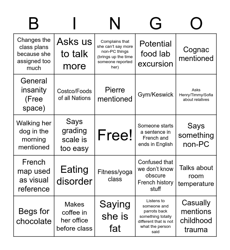 This bingo card has a free space and 25 words: Eating disorder, Saying she is fat, Pierre mentioned, Begs for chocolate, Cognac mentioned, Changes the class plans because she assigned too much, General insanity (Free space), Asks us to talk more, Someone starts a sentence in French and ends in English, Fitness/yoga class, Gym/Keswick, Walking her dog in the morning mentioned, Confused that we don’t know obscure French history stuff, Talks about room temperature, Costco/Foods of all Nations, Gets mad at Chloe Z for talking too quiet, Says something non-PC, Complains that she can’t say more non-PC things (brings up the time someone reported her), Asks Henry/Timmy/Sofia about relatives, Says grading scale is too easy, Casually mentions childhood trauma, Makes coffee in her office before class, French map used as visual reference, Potential food lab excursion and Listens to someone and parrots back something totally different that is not what the person said.