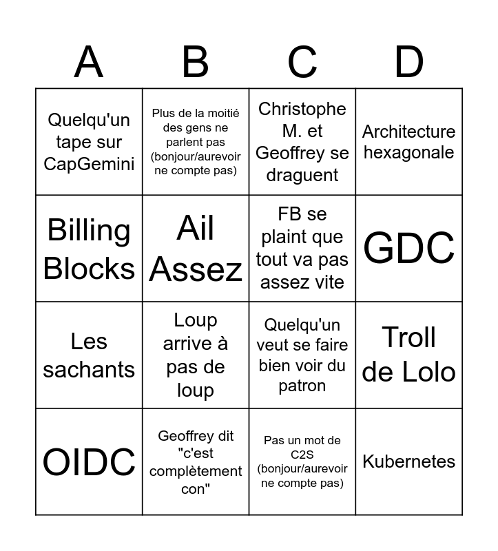 This bingo card has 16 words: Geoffrey dit "c'est complètement con", Troll de Lolo, Christophe M. et Geoffrey se draguent, Quelqu'un tape sur CapGemini, Les sachants, Plus de la moitié des gens ne parlent pas (bonjour/aurevoir ne compte pas), Quelqu'un veut se faire bien voir du patron, Pas un mot de C2S (bonjour/aurevoir ne compte pas), Billing Blocks, Ail Assez, OIDC, Architecture hexagonale, Loup arrive à pas de loup, GDC, FB se plaint que tout va pas assez vite and Kubernetes.
