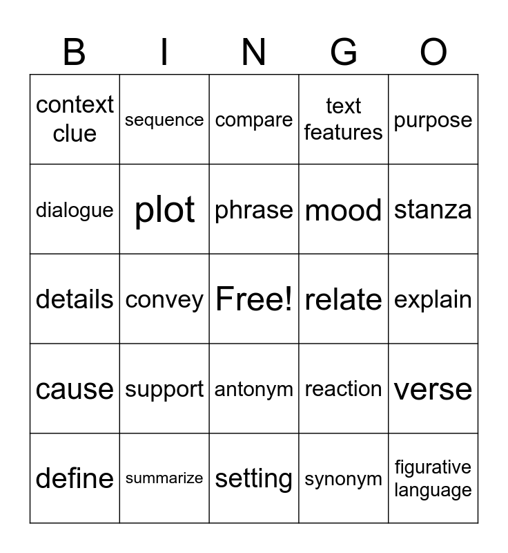 This bingo card has a free space and 34 words: similarities, synonym, prefix, opinion, cause, plot, purpose, define, sequence, theme, phrase, compare, effect, suffix, relate, stanza, summarize, details, support, reaction, antonym, character traits, context clue, explain, setting, figurative language, text features, infer, mood, dialogue, character, convey, verse and excerpt.