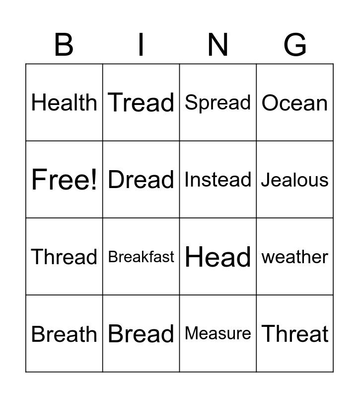 This bingo card has 16 words: Bread, weather, Spread, Health, Thread, Tread, Head, Measure, Free!, Dread, Breath, Ocean, Breakfast, Jealous, Instead and Threat.