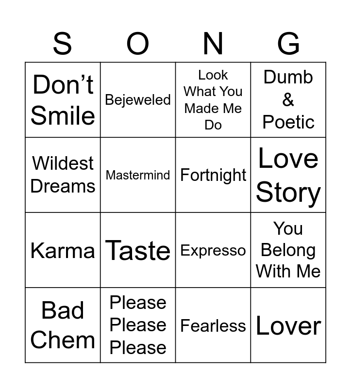 This bingo card has 34 words: Blank Space, Don’t Blame Me, Anti-Hero, Cardigan, Lover, Fortnight, Wildest Dreams, 22, Bejeweled, Speak Now, Love Story, Look What You Made Me Do, Bad Blood, Our Song, Please Please Please, Taste, Juno, Expresso, Nonsense, We Are Never (Getting Back), Coincidence, Slim Pickins, Don’t Smile, Fearless, Good Graces, Bad Chem, Dumb & Poetic, Lie to Girls, Karma, Mastermind, Shake It Off, You Belong With Me, I Can Do It With A Broken Heart and Lavender Haze.