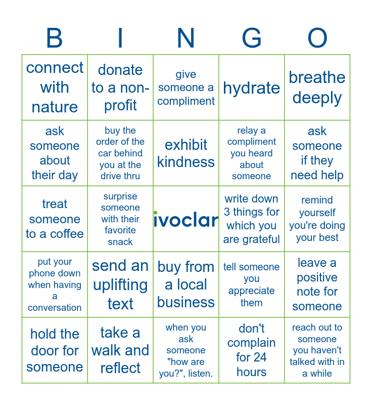 This bingo card has a free space and 24 words: send an uplifting text, take a walk and reflect, exhibit kindness, hold the door for someone, breathe deeply, connect with nature, ask someone about their day, donate to a non-profit, write down 3 things for which you are grateful, buy from a local business, relay a compliment you heard about someone, treat someone to a coffee, tell someone you appreciate them, leave a positive note for someone, buy the order of the car behind you at the drive thru, don't complain for 24 hours, remind yourself you're doing your best, give someone a compliment, ask someone if they need help, surprise someone with their favorite snack, reach out to someone you haven't talked with in a while, put your phone down when having a conversation, hydrate and when you ask someone "how are you?", listen..