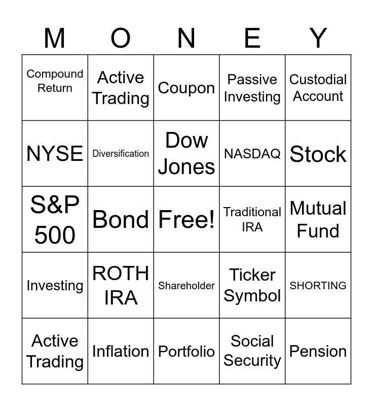 This bingo card has a free space and 29 words: Active Trading, Dividend, Bond, Brokerage Account, Compound Return, Coupon, Diversification, ROTH IRA, Traditional IRA, Inflation, Mutual Fund, Pension, Portfolio, Social Security, Stock, 401k Plan, Shareholder, Investing, Custodial Account, S&P 500, Ticker Symbol, Bitcoin, NASDAQ, NYSE, Passive Investing, Active Trading, SHORTING, Dow Jones and Interest.