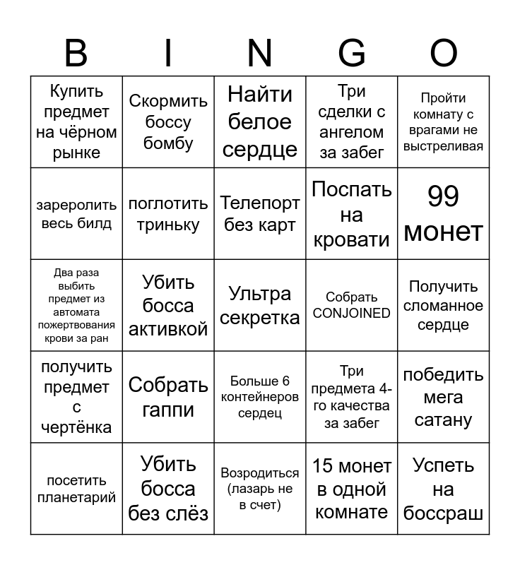 This bingo card has 25 words: Собрать гаппи, Возродиться (лазарь не в счет), Телепорт без карт, посетить планетарий, Пройти комнату с врагами не выстреливая, Купить предмет на чёрном рынке, зареролить весь билд, Скормить боссу бомбу, Собрать CONJOINED, Больше 6 контейнеров сердец, Поспать на кровати, Два раза выбить предмет из автомата пожертвования крови за ран, Три предмета 4-го качества за забег, победить мега сатану, поглотить триньку, Успеть на боссраш, Получить сломанное сердце, Найти белое сердце, 99 монет, Убить босса активкой, Ультра секретка, Убить босса без слёз, получить предмет с чертёнка, Три сделки с ангелом за забег and 15 монет в одной комнате.