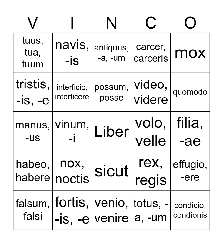 This bingo card has a free space and 74 words: invenio, invenire, ecce!, antiquus, -a, -um, aliquis, aliquid, aeternus, -a, -um, iratus, -a, -um, somnium, -i, peto, petere, falsum, falsi, ad, a, ab, gladium, -i, possum, posse, tristis, -is, -e, mortuus, -a, -um, vinum, -i, longe, quomodo, sagitta, -ae, manus, -us, interficio, interficere, navis, -is, carcer, carceris, fenestra, -ae, condicio, condionis, consentio, consentire, prope, mare, maris, quotannis, minime, mox, timidus, -a, -um, invidiosus, -a, -um, linea, -ae, consumo, -ere, totus, -a, -um, quoque, ruber, rubra, rubrum, solutio, solutionis, nescio, nescire, venio, venire, fortis, -is, -e, alius, alia, aliud, deinde, ala, alae, tuus, tua, tuum, meus, mea, meum, nox, noctis, stella, stellae, murus, -i, porta, -ae, certe, filia, -ae, caecus, -a, -um, sol, solis, corona, -ae, sicut, sapiens (sapientis), ineptus, -a, -um, effugio, -ere, video, videre, audio, audire, habeo, habere, eo, ire, volo, velle, nolo, nolle, scio, scire, domus, -us, rex, regis, regina, -ae, pulcher, pulchra, pulchrum, taurus, -i, ego and tu.