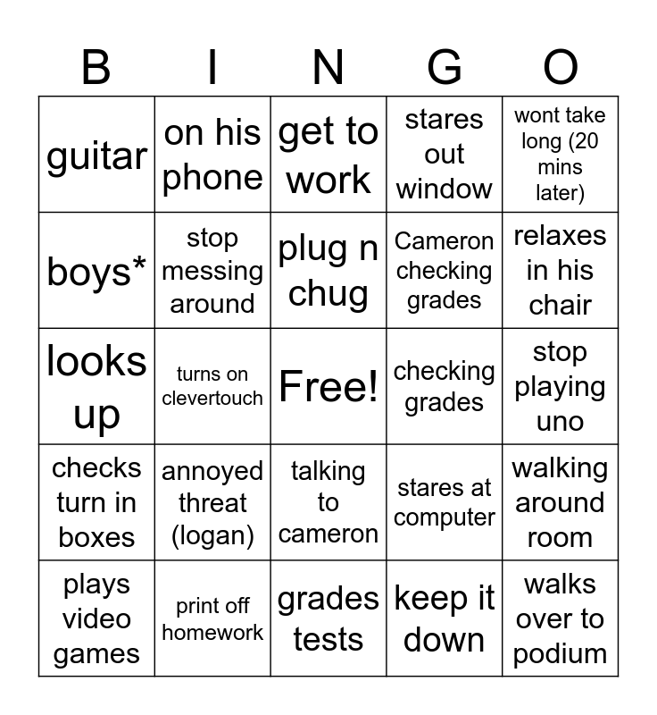 This bingo card has a free space and 24 words: annoyed threat (logan), print off homework, plug n chug, plays video games, wont take long (20 mins later), guitar, boys*, on his phone, checking grades, talking to cameron, Cameron checking grades, looks up, stares at computer, walking around room, stop messing around, keep it down, stop playing uno, get to work, relaxes in his chair, turns on clevertouch, walks over to podium, checks turn in boxes, stares out window and grades tests.