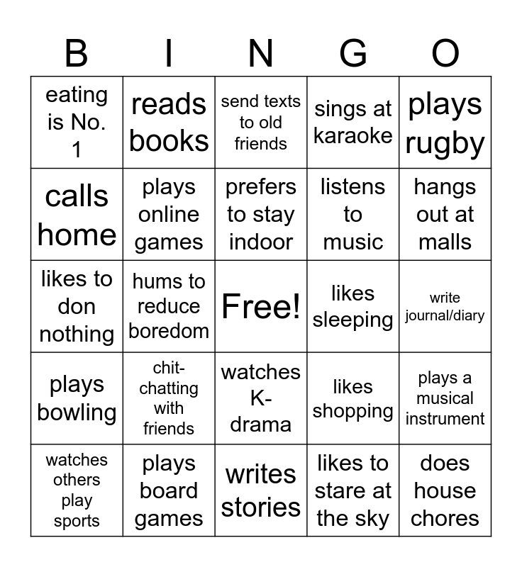 This bingo card has a free space and 24 words: chit-chatting with friends, plays board games, prefers to stay indoor, watches others play sports, plays rugby, eating is No. 1, calls home, reads books, likes sleeping, watches K- drama, listens to music, likes to don nothing, likes shopping, plays a musical instrument, plays online games, likes to stare at the sky, write journal/diary, send texts to old friends, hangs out at malls, hums to reduce boredom, does house chores, plays bowling, sings at karaoke and writes stories.