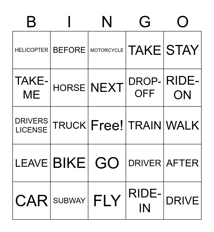 This bingo card has a free space and 29 words: CAR, BUS, TRUCK, PLANE, HELICOPTER, MOTORCYCLE, HORSE, BIKE, TRAIN, SUBWAY, WALK, DRIVE, FLY, RIDE-IN, RIDE-ON, COME-TO, GO, LEAVE, STAY, DRIVERS LICENSE, DRIVER, PICK-UP, DROP-OFF, TAKE-ME, TAKE, BEFORE, AFTER, NEXT and WITH.