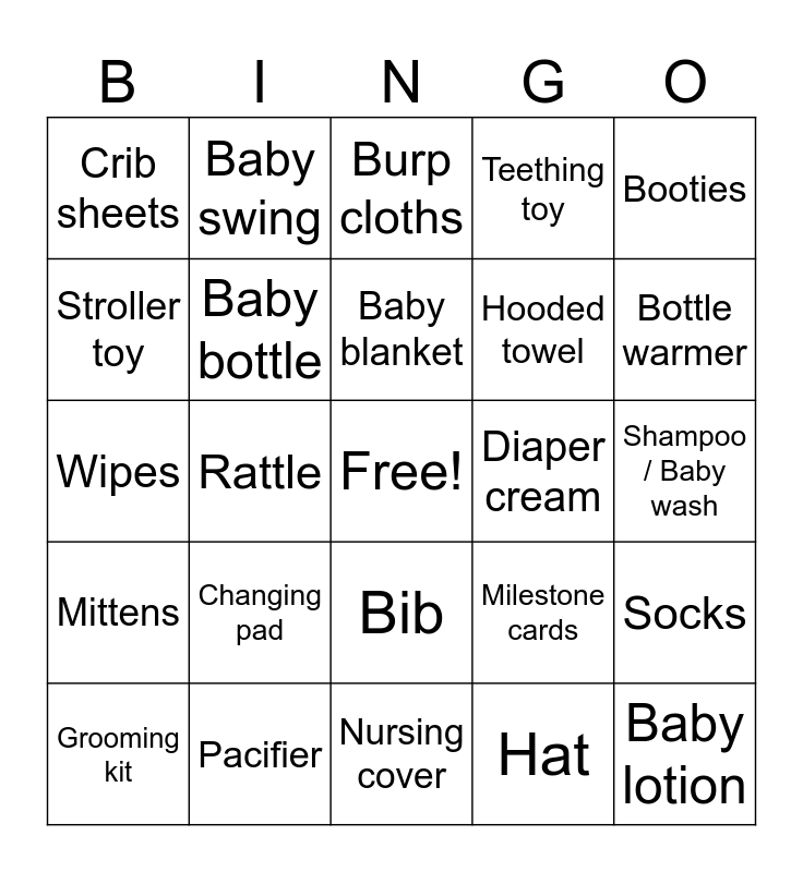 This bingo card has a free space and 40 words: Diapers, Wipes, Onesies, Baby bottle, Pacifier, Bib, Baby blanket, Swaddle, Booties, Mittens, Rattle, Teething toy, Baby lotion, Shampoo / Baby wash, Diaper cream, Changing pad, Baby monitor, Crib sheets, Nursing pillow, Burp cloths, Socks, Hat, Hooded towel, Stroller toy, Books, Stuffed animal, Baby carrier, Bathtub, Diaper bag, High chair, Thermometer, Grooming kit, Bibs with sayings, Milestone cards, Bottle warmer, Nursing cover, Car seat, Stroller, Baby swing and Gift card.