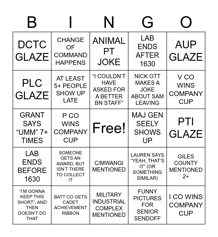 This bingo card has a free space and 24 words: SOMEONE GETS AN AWARD, BUT ISN’T THERE TO COLLECT IT, BATT CO GETS CADET ACHIEVEMENT RIBBON, “I COULDN’T HAVE ASKED FOR A BETTER BN STAFF”, “I’M GONNA KEEP THIS SHORT”, AND THEN DOESN’T DO THAT, AUP GLAZE, DCTC GLAZE, PLC GLAZE, CHANGE OF COMMAND HAPPENS, MAJ GEN SEELY SHOWS UP, C/MWANGI MENTIONED, NICK OTT MAKES A JOKE ABOUT SAM LEAVING, GRANT SAYS “UMM” 7+ TIMES, LAUREN SAYS “YEAH, THAT’S IT” (OR SOMETHING SIMILAR), GILES COUNTY MENTIONED 2+, AT LEAST 5+ PEOPLE SHOW UP LATE, FUNNY PICTURES FOR SENIOR SENDOFF, PTI GLAZE, ANIMAL PT JOKE, V CO WINS COMPANY CUP, P CO WINS COMPANY CUP, I CO WINS COMPANY CUP, LAB ENDS BEFORE 1630, LAB ENDS AFTER 1630 and MILITARY INDUSTRIAL COMPLEX MENTIONED.