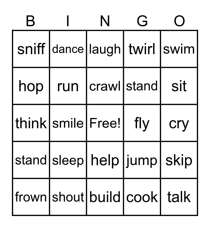 This bingo card has a free space and 24 words: frown, sleep, crawl, cook, swim, sniff, dance, laugh, fly, cry, think, run, jump, skip, hop, shout, build, twirl, sit, stand, smile, help, stand and talk.
