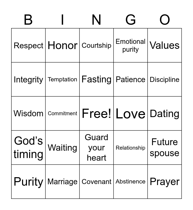 This bingo card has a free space and 29 words: Purity, Boundaries, Commitment, Self-control, Respect, Courtship, Temptation, Waiting, Love, Marriage, Dating, Prayer, Covenant, Abstinence, Discipline, Accountability, Guard your heart, God’s timing, Values, Wisdom, Relationship, Truth, Patience, Integrity, Emotional purity, Honor, Future spouse, Fasting and Communication.