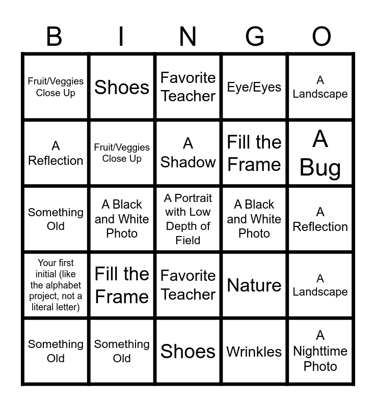 ⚠ This card has duplicate items: Something Green (3), Favorite Teacher (3), Something You Love (3), Something Smooth (3), Leading Lines (3), Repetition (3), Rule of Thirds (3), Something Spikey (3), Nature (3), A Bug (3), Fill the Frame (3), A Shadow (3), A Reflection (3), Wrinkles (3), A Black and White Photo (3), Something really colorful (3), A Nighttime Photo (3), Family (whatever that means to you) (3), A Landscape (3), Your first initial (like the alphabet project, not a literal letter) (3), Something Old (3), Fruit/Veggies Close Up (3), Shoes (3), Eye/Eyes (3), A Portrait with Low Depth of Field (2)