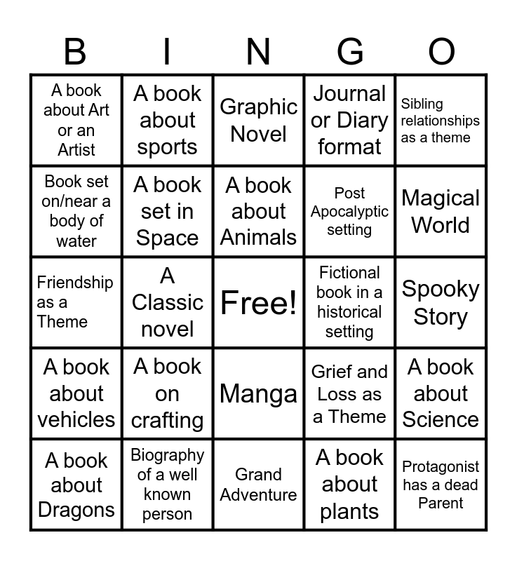 This bingo card has a free space and 29 words: A book about Dragons, Vampire, Werewolf, or Zombie Book, A Classic novel, A film adapted book, A book about Art or an Artist, Graphic Novel, A book set in Space, A book on crafting, Fictional book in a historical setting, Biography of a well known person, Spooky Story, Protagonist has a dead Parent, Grand Adventure, A book about plants, Magical World, Set in the Future, Manga, A book about vehicles, Sibling relationships as a theme, Friendship as a Theme, Grief and Loss as a Theme, Book Series, Post Apocalyptic setting, Book set on/near a body of water, Journal or Diary format, A book about sports, A book about Science, A book about Animals and Time Travel.