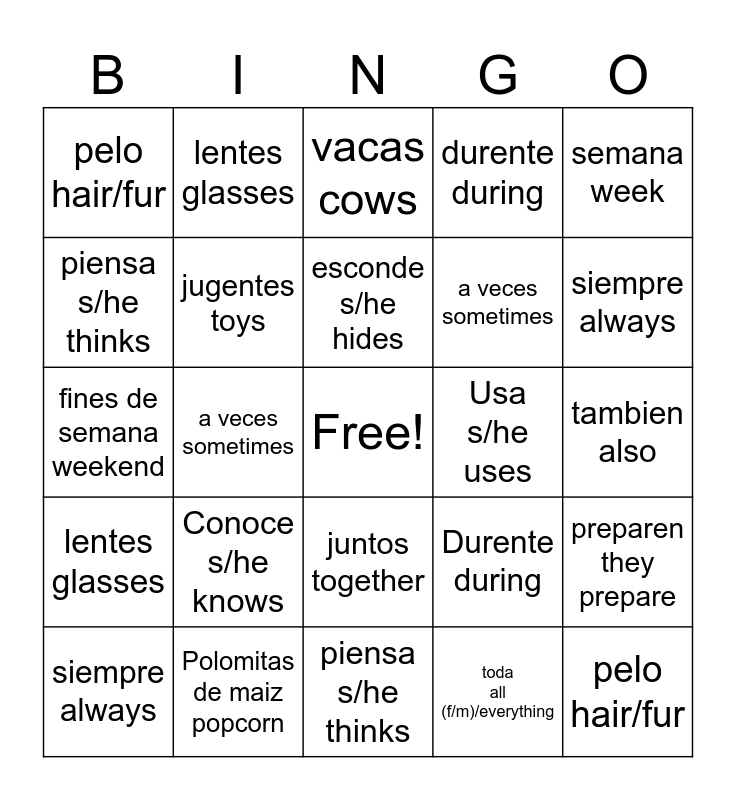 This bingo card has a free space and 24 words: Conoce s/he knows, Polomitas de maiz popcorn, esconde s/he hides, siempre always, semana week, pelo hair/fur, piensa s/he thinks, lentes glasses, Usa s/he uses, juntos together, a veces sometimes, fines de semana weekend, Durente during, preparen they prepare, jugentes toys, toda all (f/m)/everything, tambien also, vacas cows, siempre always, a veces sometimes, pelo hair/fur, lentes glasses, durente during and piensa s/he thinks.