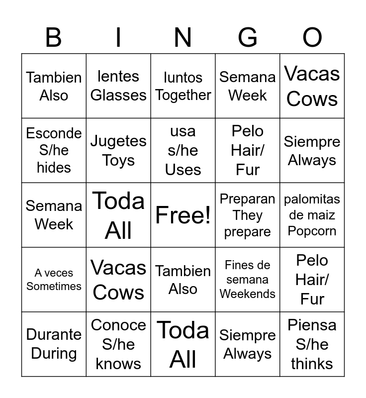This bingo card has a free space and 24 words: Vacas Cows, Conoce S/he knows, usa s/he Uses, Durante During, Vacas Cows, Tambien Also, Esconde S/he hides, lentes Glasses, Preparan They prepare, Tambien Also, Pelo Hair/ Fur, Semana Week, Fines de semana Weekends, Pelo Hair/ Fur, Jugetes Toys, Siempre Always, palomitas de maiz Popcorn, Iuntos Together, Siempre Always, Toda All, Piensa S/he thinks, A veces Sometimes, Semana Week and Toda All.
