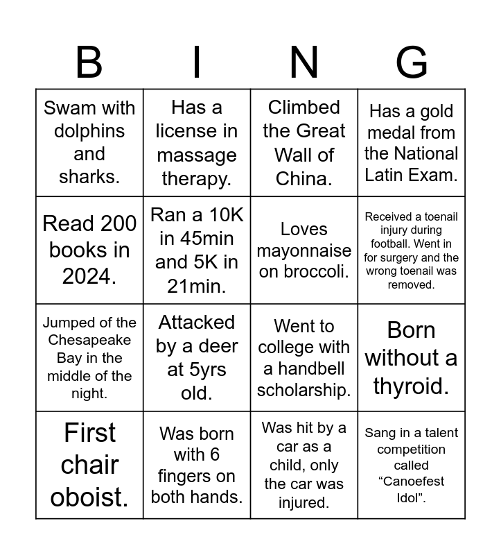 This bingo card has 16 words: Was born with 6 fingers on both hands., Born without a thyroid., Climbed the Great Wall of China., Swam with dolphins and sharks., Jumped of the Chesapeake Bay in the middle of the night., Has a license in massage therapy., Went to college with a handbell scholarship., Was hit by a car as a child, only the car was injured., Read 200 books in 2024., Ran a 10K in 45min and 5K in 21min., First chair oboist., Has a gold medal from the National Latin Exam., Attacked by a deer at 5yrs old., Received a toenail injury during football. Went in for surgery and the wrong toenail was removed., Loves mayonnaise on broccoli. and Sang in a talent competition called “Canoefest Idol”..