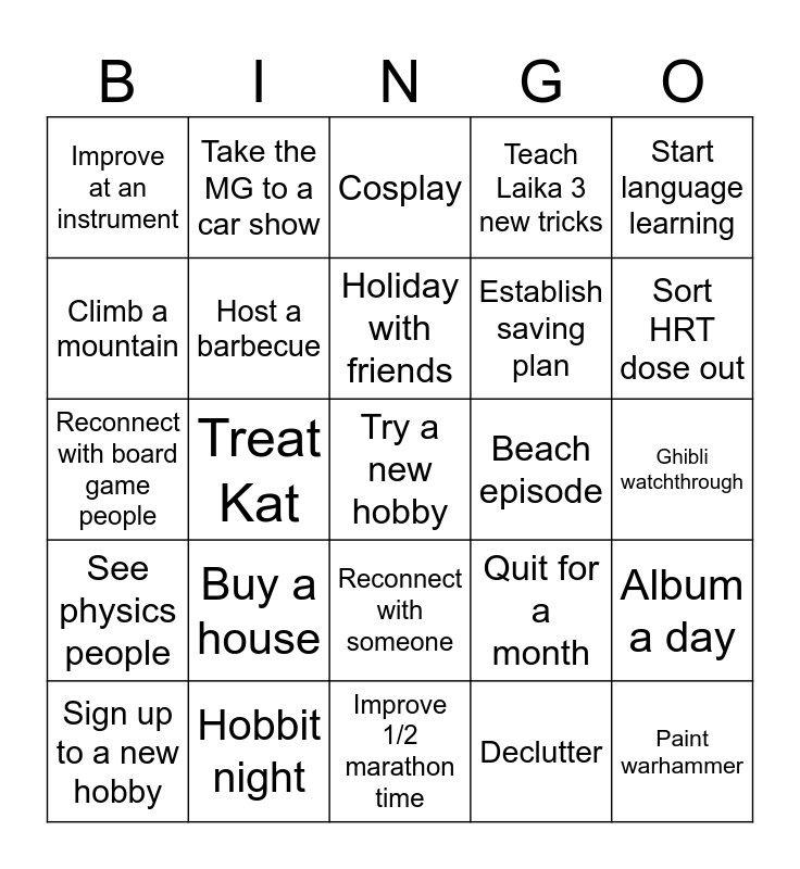 This bingo card has 25 words: Buy a house, Improve 1/2 marathon time, Holiday with friends, Sign up to a new hobby, Start language learning, Improve at an instrument, Climb a mountain, Take the MG to a car show, Beach episode, Reconnect with someone, Establish saving plan, Reconnect with board game people, Quit for a month, Album a day, Host a barbecue, Paint warhammer, Ghibli watchthrough, Cosplay, Sort HRT dose out, Treat Kat, Try a new hobby, Hobbit night, See physics people, Teach Laika 3 new tricks and Declutter.
