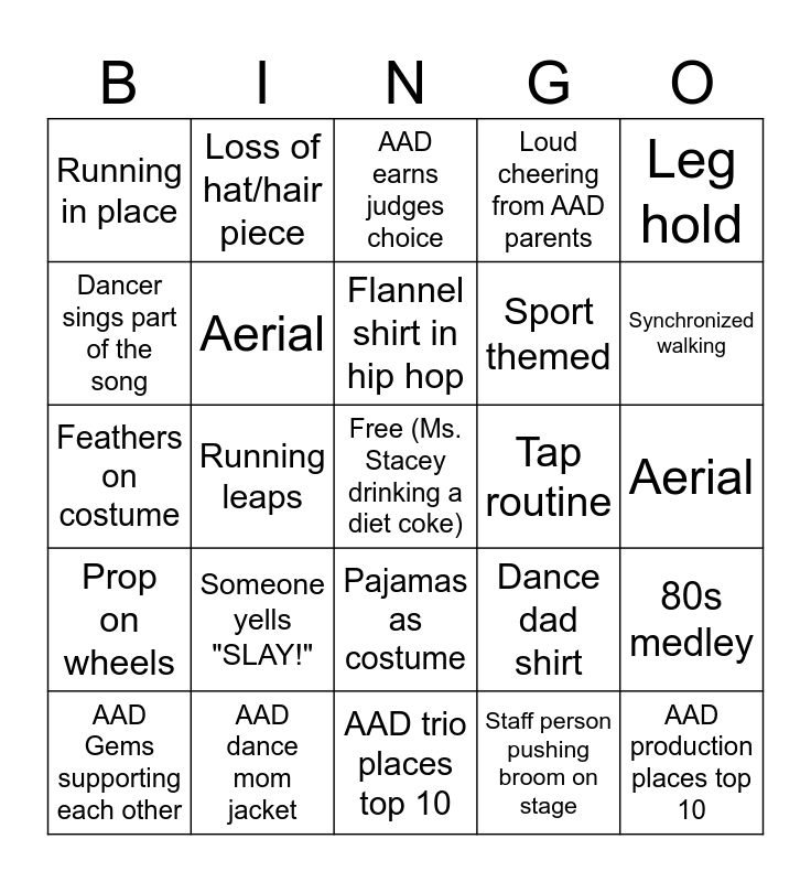 ⚠ This card has duplicate items: Feathers on costume (2), Staff person pushing broom on stage (2), Dancer is carried onto stage (2), Aerial (2), Leg hold (2), Tap routine (2), Dancer sings part of the song (2), Running leaps (2), Running in place (2), Synchronized walking (2), Sport themed (2), Someone yells "SLAY!" (2), Prop on wheels (2), Loud cheering from AAD parents (2), AAD solo places top 10 (2), AAD duo places top 10 (2), AAD trio places top 10 (2), AAD small group places top 10 (2), AAD large group places top 10 (2), AAD production places top 10 (2), AAD earns judges choice (2), AAD Gems supporting each other (2), AAD Choreographer giving hugs (2), AAD little buddy in big buddy lap (2), AAD parent doing a dance move (2), Dance dad shirt (2), AAD dance mom jacket (2), AAD senior hugging (2)