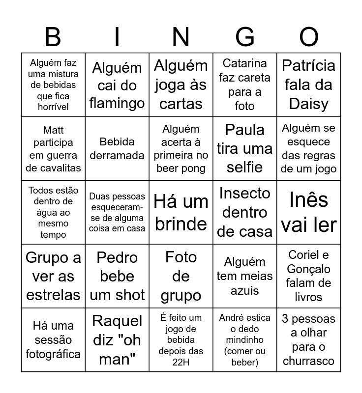 This bingo card has a free space and 24 words: Pedro bebe um shot, Raquel diz "oh man", Alguém acerta à primeira no beer pong, Há uma sessão fotográfica, Patrícia fala da Daisy, Alguém faz uma mistura de bebidas que fica horrível, Matt participa em guerra de cavalitas, Alguém cai do flamingo, Insecto dentro de casa, Foto de grupo, Paula tira uma selfie, Todos estão dentro de água ao mesmo tempo, Alguém tem meias azuis, Coriel e Gonçalo falam de livros, Bebida derramada, André estica o dedo mindinho (comer ou beber), Inês vai ler, Alguém joga às cartas, Alguém se esquece das regras de um jogo, Duas pessoas esqueceram-se de alguma coisa em casa, 3 pessoas a olhar para o churrasco, Grupo a ver as estrelas, Catarina faz careta para a foto and É feito um jogo de bebida depois das 22H.