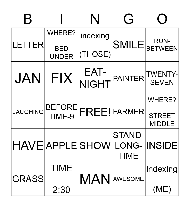 This bingo card has a free space and 24 words: APPLE, TIME 2:30, EAT-NIGHT, GRASS, RUN-BETWEEN, LETTER, JAN, WHERE? BED UNDER, FARMER, SHOW, PAINTER, LAUGHING, STAND-LONG-TIME, INSIDE, FIX, AWESOME, WHERE? STREET MIDDLE, indexing (THOSE), TWENTY-SEVEN, BEFORE TIME-9, indexing (ME), HAVE, SMILE and MAN.